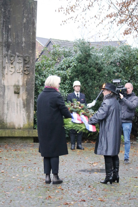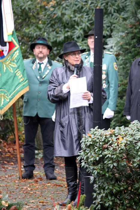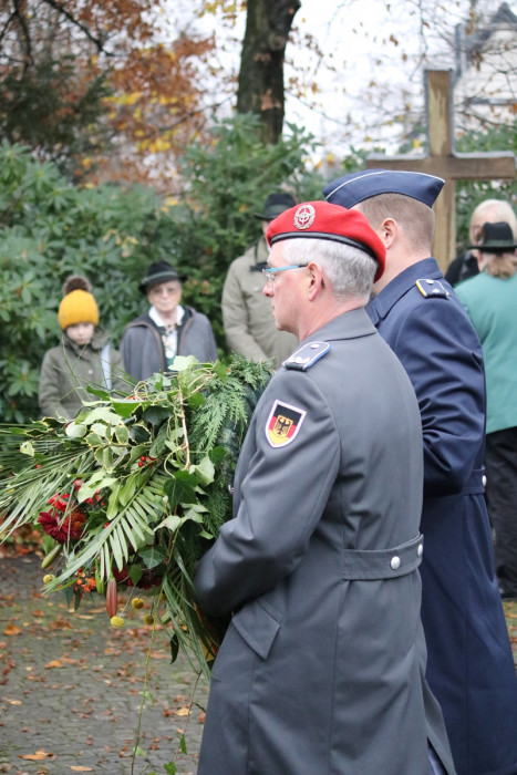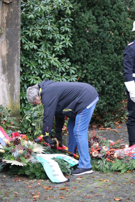 Im Beisein von Oberbürgermeisterin Katrin Schmieder gedachte Stadtpräsidentin Petra Müller-Schönemann in ihrer Rede der Opfer zweier Weltkriege, von Diktaturen und Gewaltherrschaft. Angesichts unruhiger Zeiten und eines Krieges mitten in Europa hob sie die Bedeutung der Bundeswehr beim Schutz unseres Landes hervor.